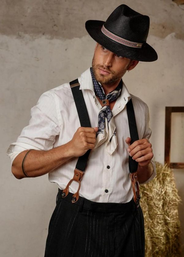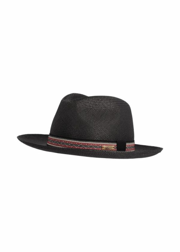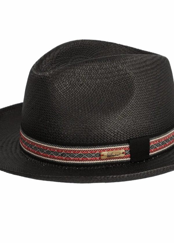 - Dieser Panamahut im Borsalino-Schnitt besteht aus echtem, schwarz eingefärbtem Stroh und zieht mit seiner gebogenen Krempe, sowie seinem Band mit Ethno-Muster in Kontrastfarben alle Blicke auf sich.